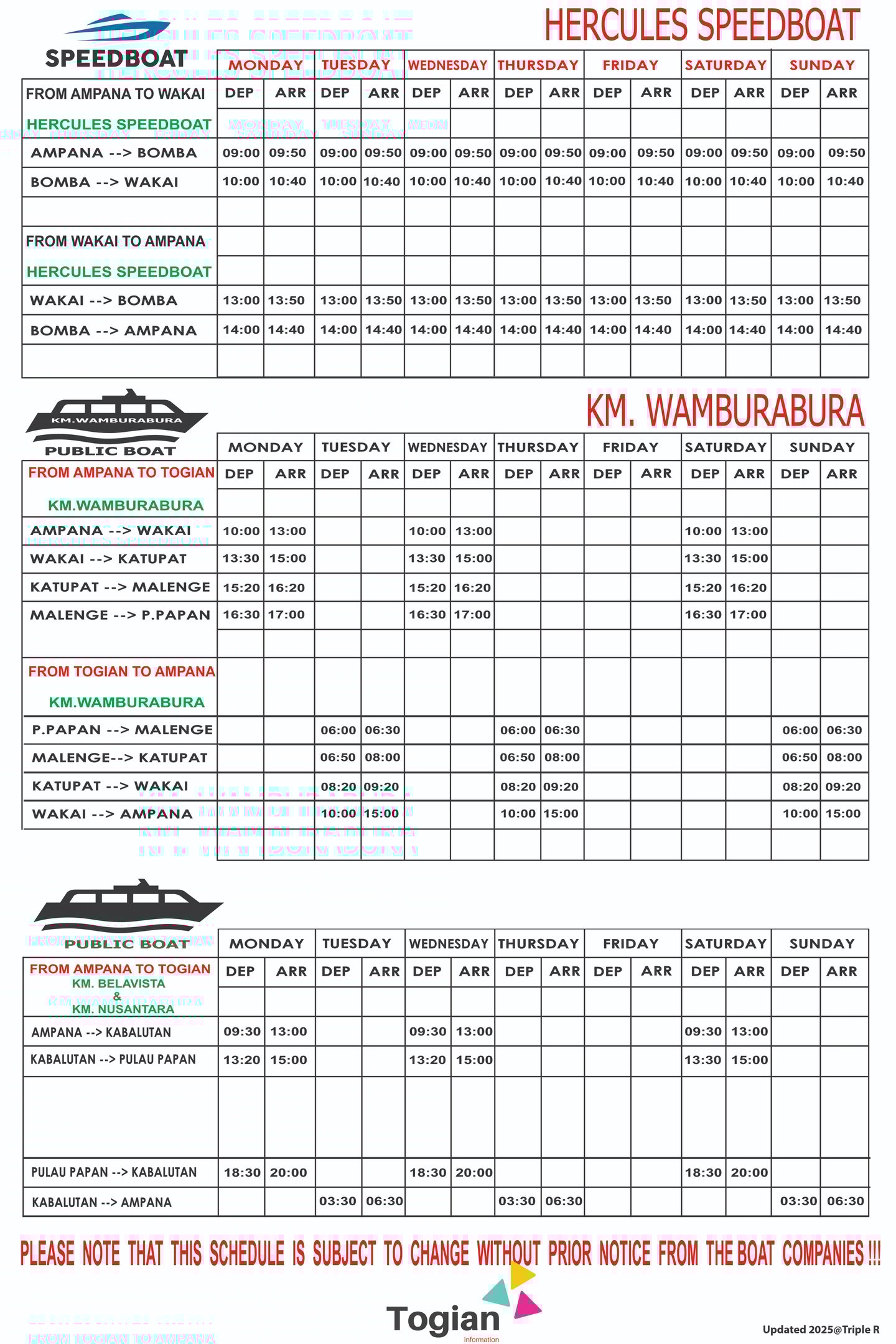 And from the Togian Islands to Ampana every Sunday, Tueaday and Thursday starting from Pulau Papan, Malenge to Katupat, Wakai and all the way down to Ampana.